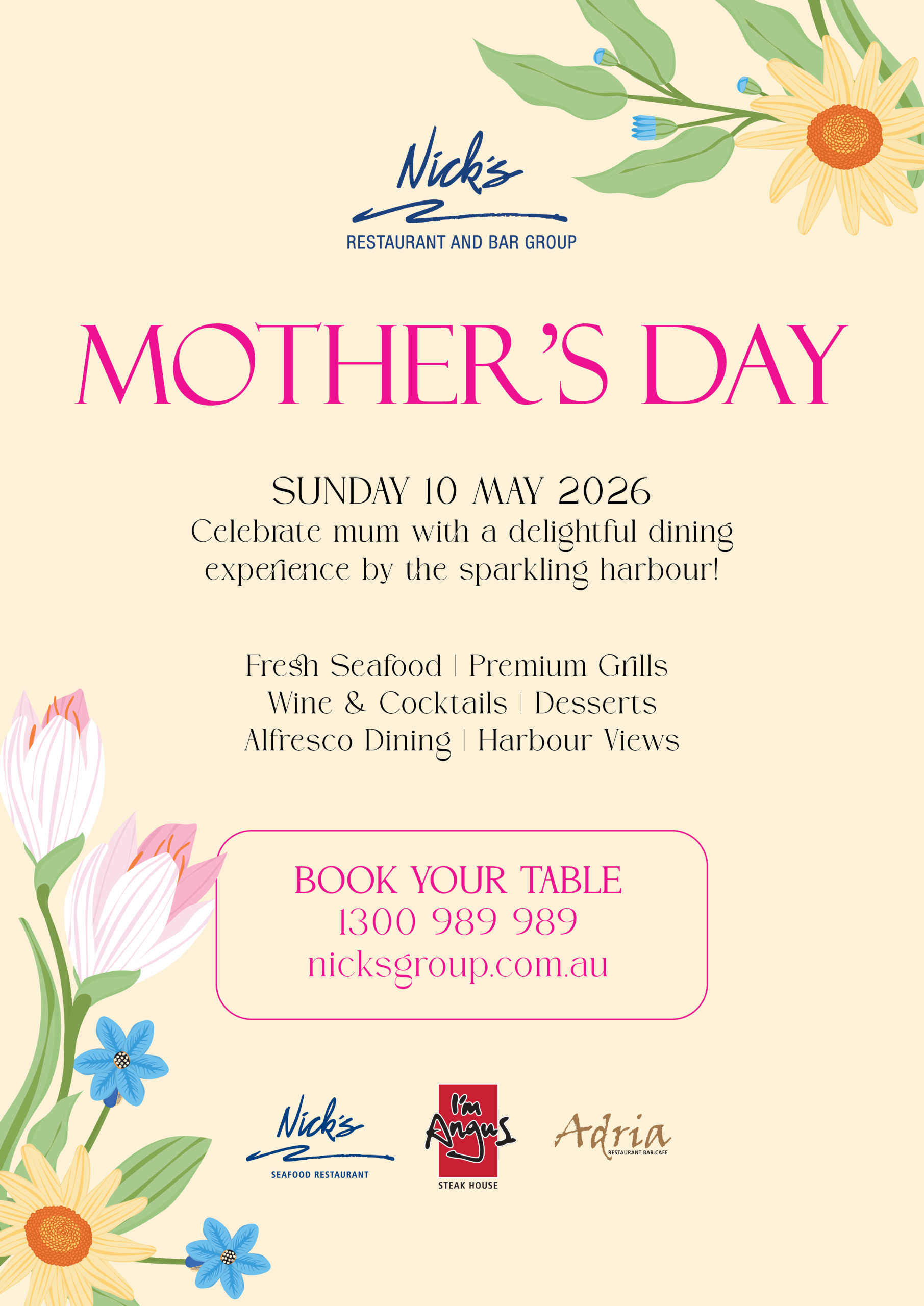 Treat Mum to an unforgettable dining experience at Nick’s Restaurant & Bar Group, where exquisite seafood, premium grill selections and breathtaking waterfront views come together to create the perfect celebration.